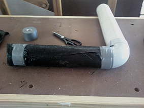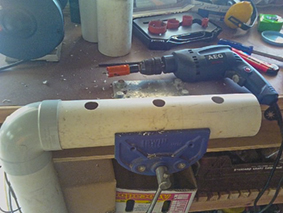 The recharge pipe is made from some off-cuts of 90mm downpipe and a spare elbow, with holes cut in the bottom to allow an even distribution of water.