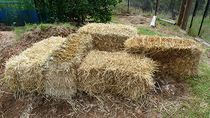 So I thought I’d give it a go, even though I couldn’t immediately see a need for strawbale plantings on our patch.  We aren’t short of space.  Having made the decision to limit our footprint on our 35ha to the area uphill along the ridge-top from the house, we have the potential to occupy a couple of hectares.  And we don’t have a soil contamination problem.  However we do have soil issues – for the most part we don’t have what you’d call “soil”, but rather decomposing sandstone with some soil-like features.  So maybe from that point of view we resemble those with concreted over yards who see strawbale gardening as one of only a very few options.