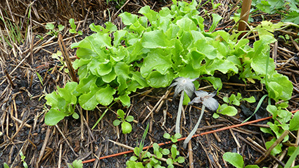 20130531_P1050875_blogEverything is looking fairly healthy at this stage, and no insect damage.  More stalks of the Coprinus fungi are visible to the right, and in the foreground of the photo below you can see a black area which is typical of the residue this fungus leaves when its cap decomposes into a sticky black mass.  We were wary of eating any of the plants which were affected by this.