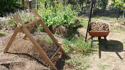 I decided to use a more or less flat area which was scheduled to become our fourth shadehouse in due course, but certainly not for many months.  So as not to get in the way of ongoing work constructing shadehouses numbers two and three, I limited myself to just six straw bales.  They were arranged in pairs with one of each pair on its wide side, and the other on its narrow side (i.e. with the straws running vertically).20130401_P1050510_blogBarley straw is what I had on hand, and is what I use by choice.  Lately it has been costing $10 per bale, no matter what the season, so the original cash outlay was $60, not counting the relatively minor cost of the blood and bone.  It isn’t actually blood and bone; the pure blood and bone meal that used to be available 60 years ago when I was growing up on a farm doesn’t seem to be available any more, so it was the “blood & bone based fertilizer” type of product.