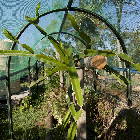 Dragon fruit need to grow up a trellis, but they need to be able to “hang” their side branches out from the main stem (or from a beam or frame on top of the trellis) in an arc.