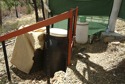 We use composting toilets, both inside and outside the house. Manure of any kind is too valuable a resource to waste. Once full, the bin is moved to the back, stocked with compost worms and left to mature until the other bin is near full. This can be up to 12 months, by which time the resting bin has produced about 150 litres of friable, rich soil ready to go into the garden beds. In this photo the bin on the left is covered with shade cloth to stop it getting too hot in the summer sun.