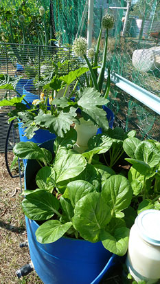 The loss of this greywater matters in our dry climate. One of the solutions we are trying in order to save water is the use of wicking pots to grow vegetables. In this method water is stored in the bottom of the pot, and wicks up through the soil to the root zone. The only water that escapes is what is transpired through the leaves of the plants. Depending on the size of the plants and the weather the water needs topping up only every four to seven days.
