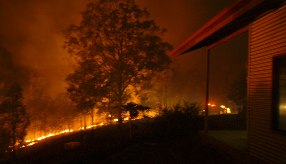I spent the next couple of hours helping to put out spot fires and checking for embers in and around the house and workshop. The wind had picked up even more, and there were “floaters” of burning bark and leaves dropping fifty metres or more from the fire front. We were lucky that they had done a lot of work preparing their property for the fire season, with a number of tracks acting as containment lines, and wide areas of short, mowed grass around the house. Even so, with the flames periodically blown horizontal by the wind, the fire was easily jumping tracks three metres wide.